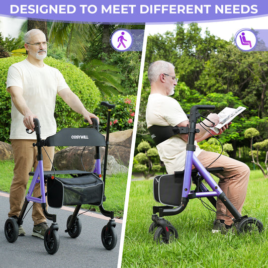 COSYWILL Aluminum Rollator Walker with Seat,Height Adjustable Mobility Walker with 8" Wheels,350 lb Weight Capacity,Purple