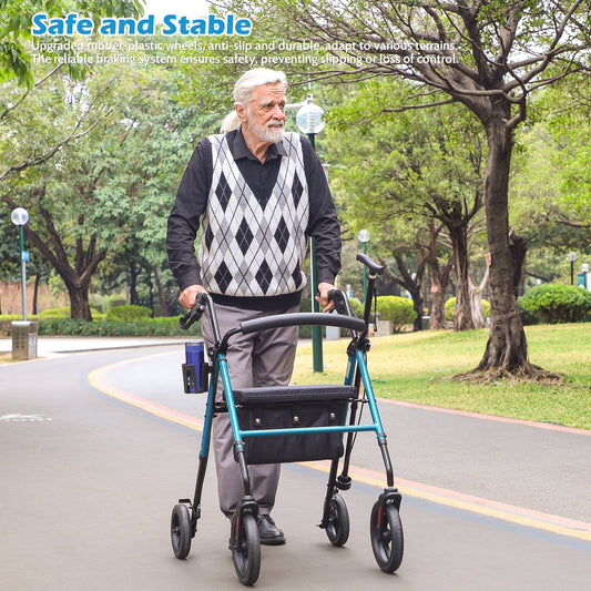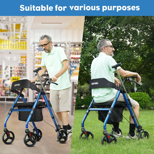 COSYWILL Rollator Walker with Seat,Foldable Mobility Walker with Durable Steel,Rolling Walker with 8" Wheels for All Terrain,Adjustable Height,300 lbs,Blue