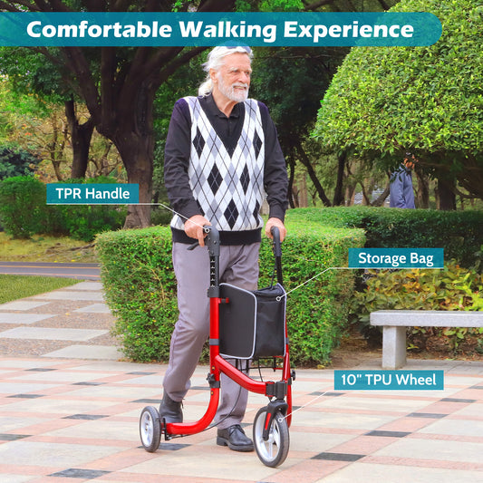 COSYWILL 3 Wheel Rollator Walkers for Seniors,Ultra Lightweight Foldable Walker for Elderly with Storage Bag, 10" Three Wheel Modern Mobility Walking Aid Aluminum,Red