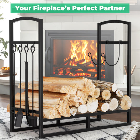 Lookfly Firewood Rack with 5-Piece Fireplace Tool Set & Kindling Holder – Indoor/Outdoor Wood Storage & Organizer for Fire Pit or Fireplace