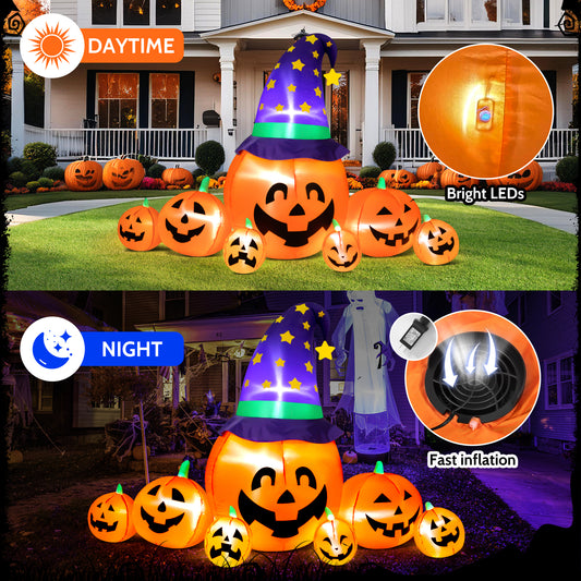 IZNEN 8ft Halloween Inflatable Blow Up Pumpkin Decoration, 7 Pumpkins with Witches Hat, Built-in LED Lights for Halloween Holiday, Yard, Garden, Lawn
