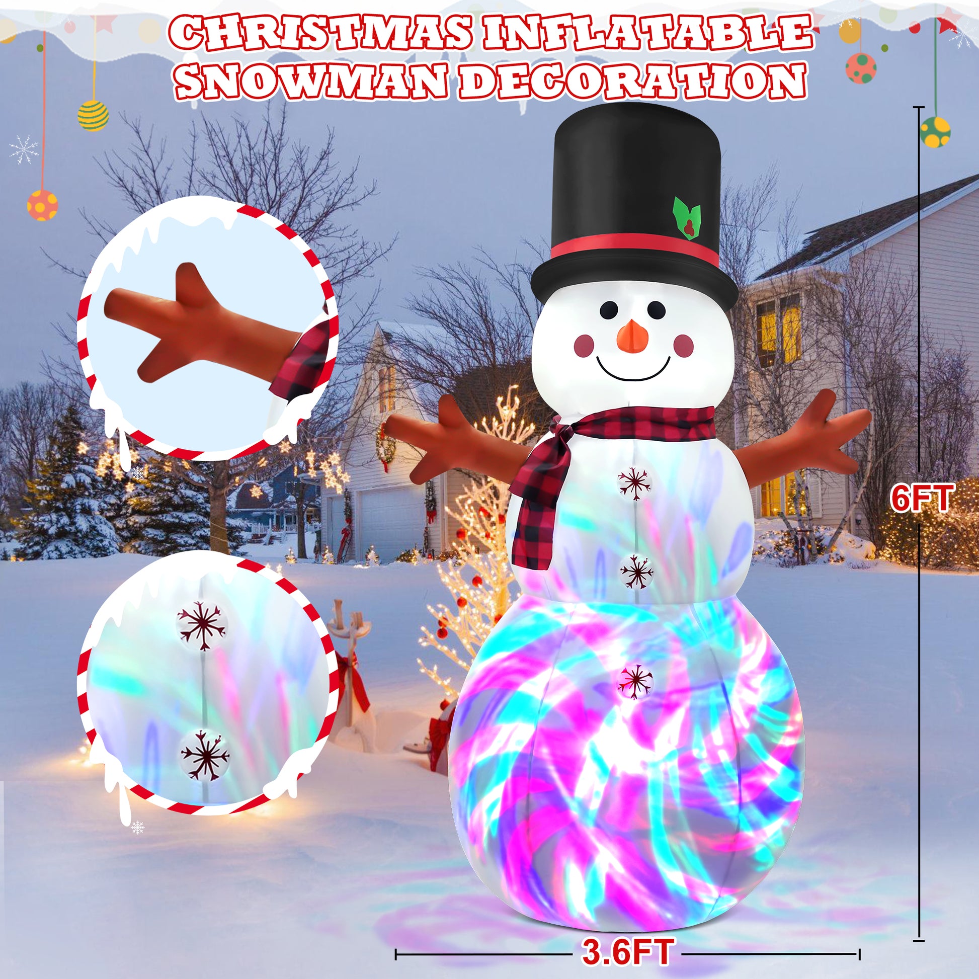 - 🎊【Rotating Disco Multicolor Light】:The inflatable snowman decoration features a vibrant rotating disco light with dynamic effects, adding a rich winter holiday atmosphere. Its colorful and playful design brings the magic of Christmas to life in your backyard, creating a joyful and festive ambiance.