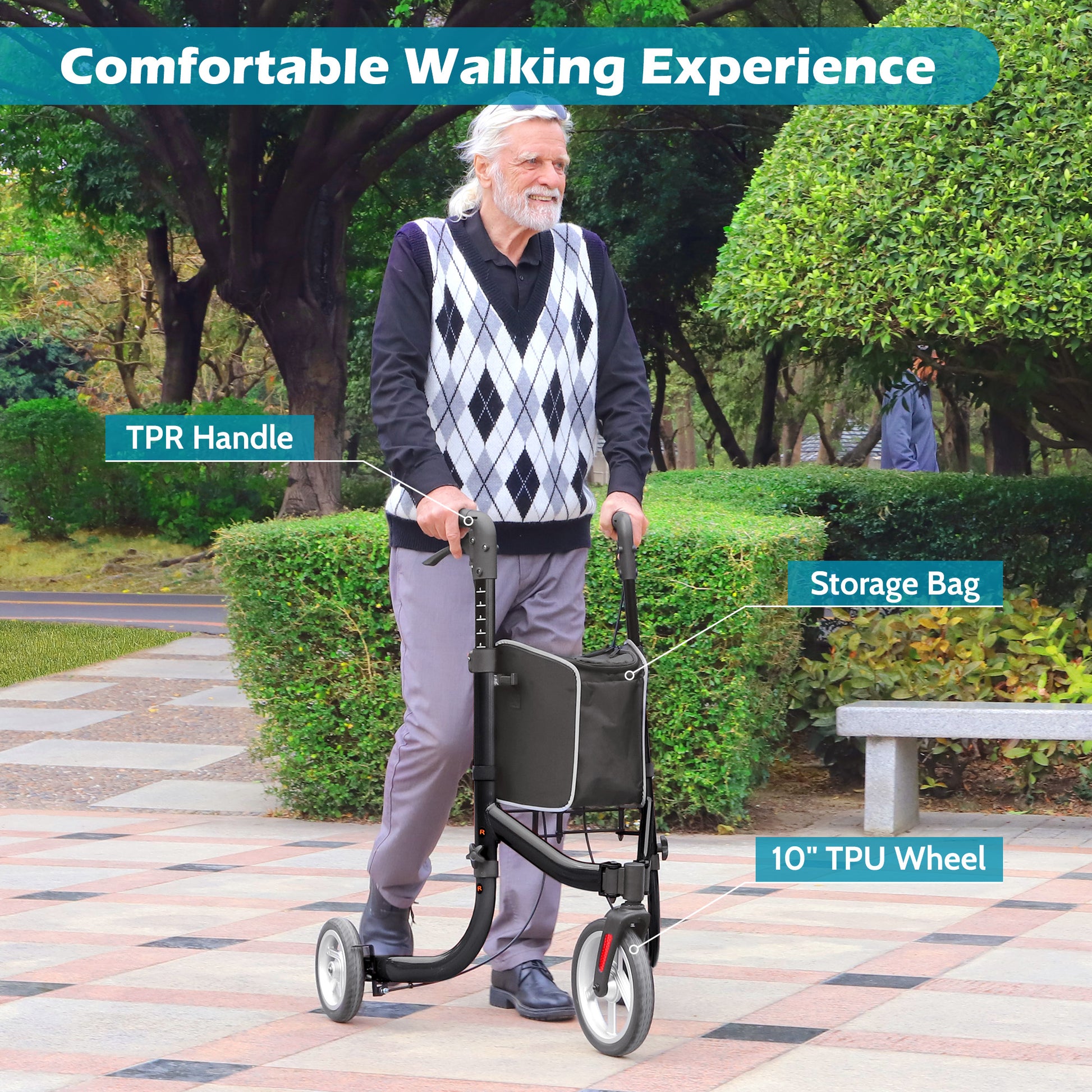 - ✅【10" Large Front Wheels】:This three-wheel walker features a 10" TPU front wheel with a 360°swivel design for flexible maneuverability on various terrains. The durable, shock-absorbing TPU material ensures smooth and stable movement, making it ideal for both indoor and outdoor use.