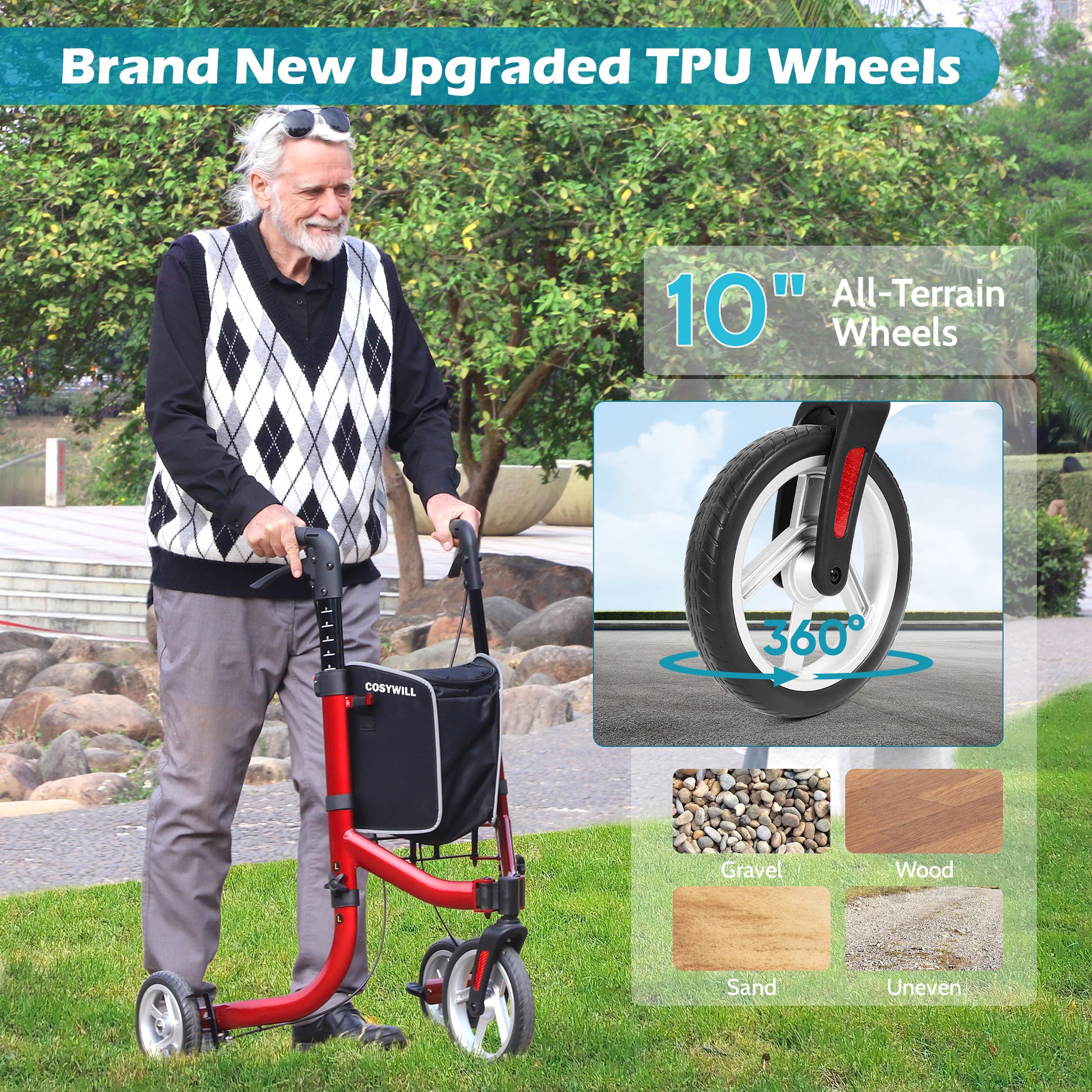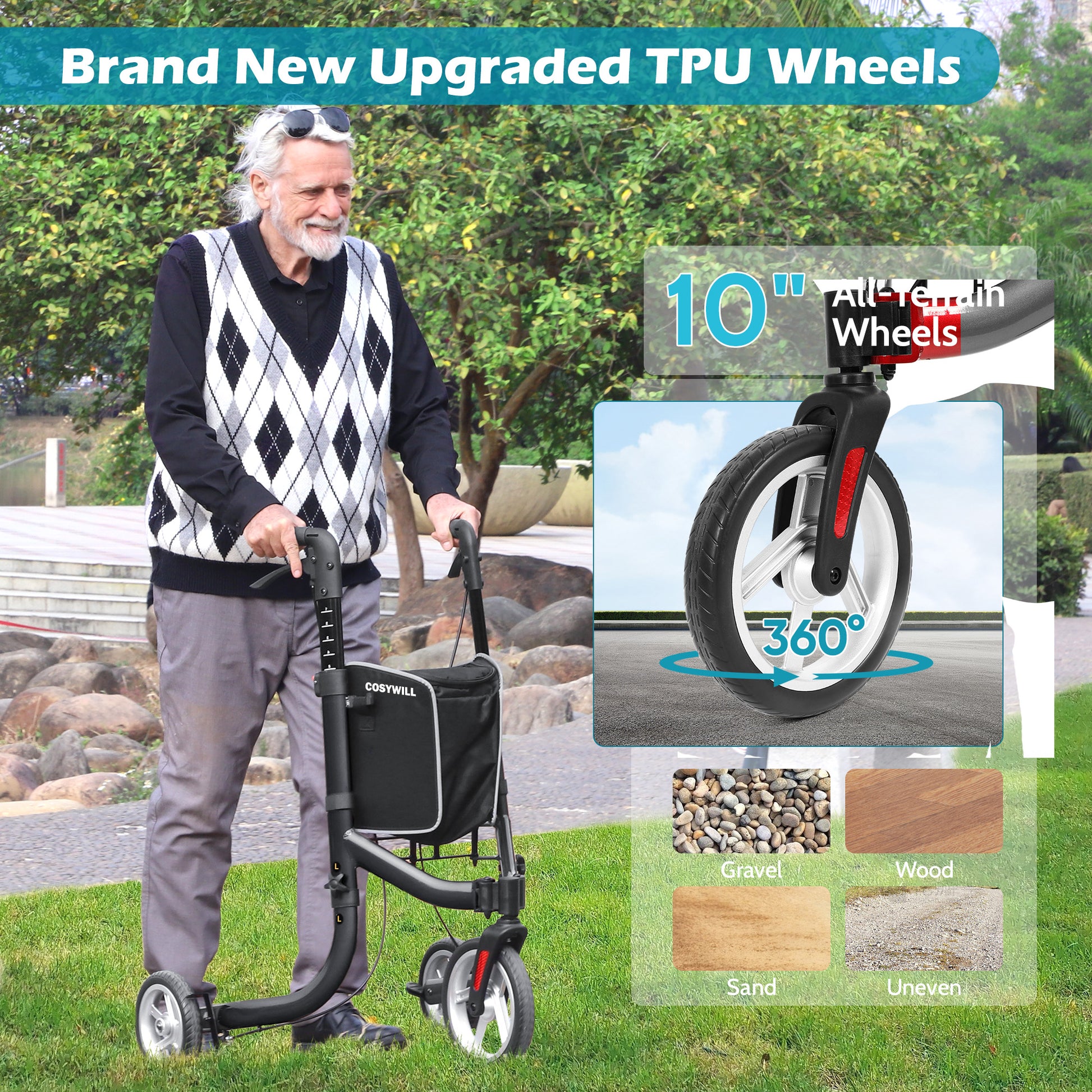 COSYWILL three-wheel walker features 10-inch TPU front wheels with a 360° rotating design, adapting to various terrains and providing flexible maneuverability. The 3 Wheel Rollator Walkers lightweight aluminum frame weighs 11.9 lbs and supports up to 300 lbs, ensuring durability and stability. Ergonomic handles and TPR non-slip grips enhance comfort and safety, making it ideal for both indoor and outdoor use.
