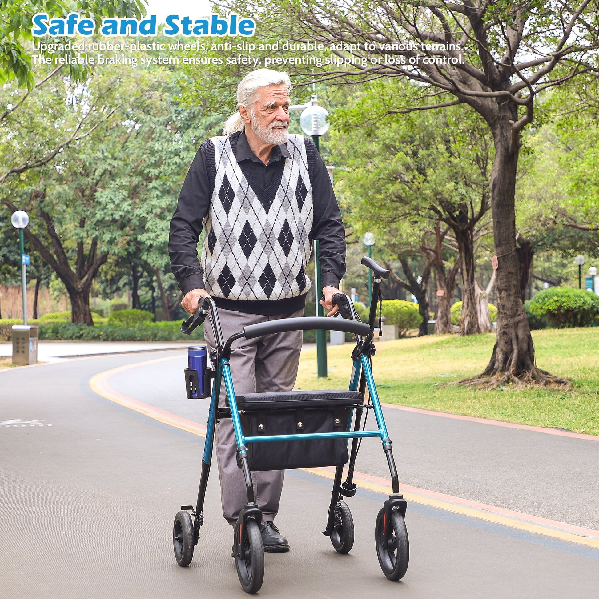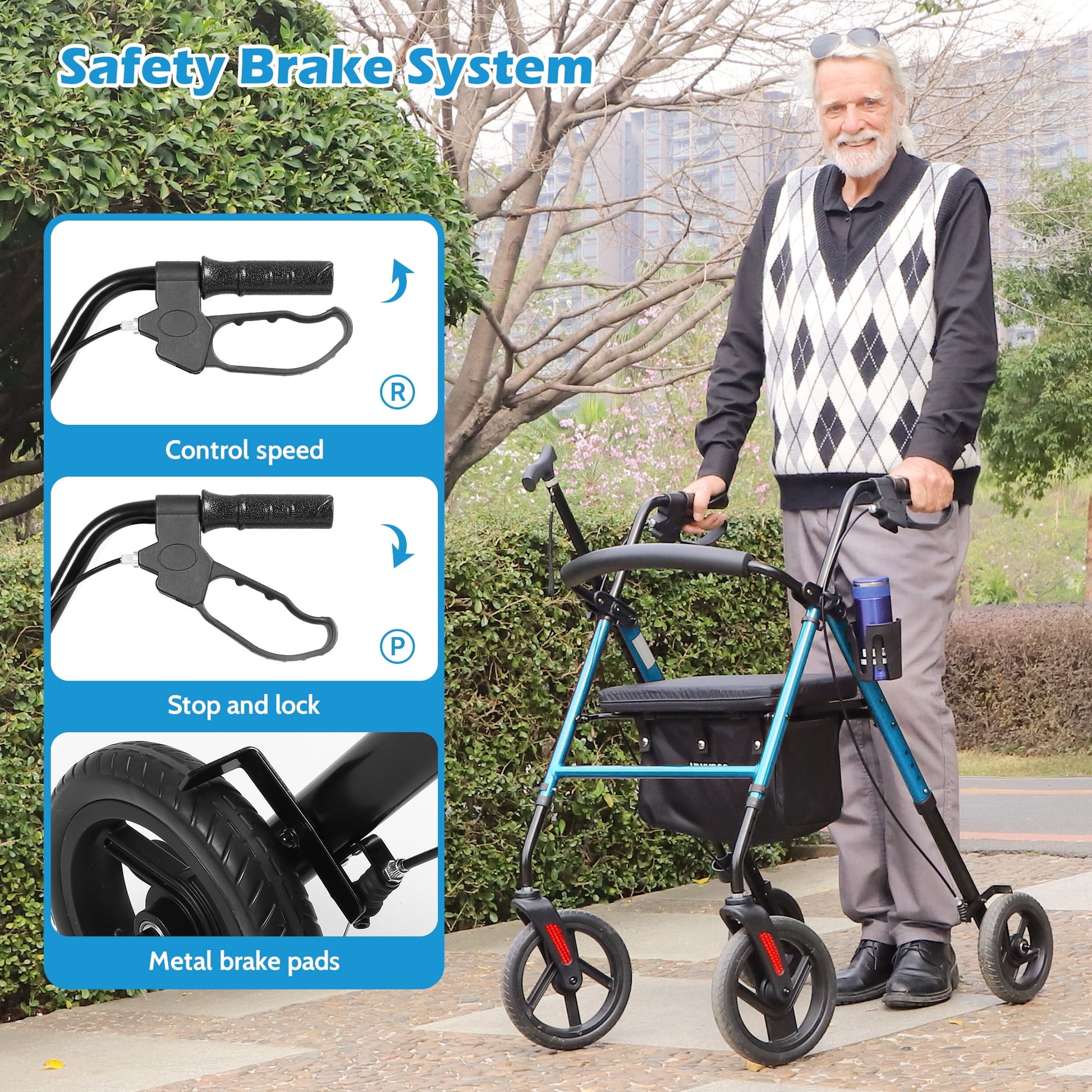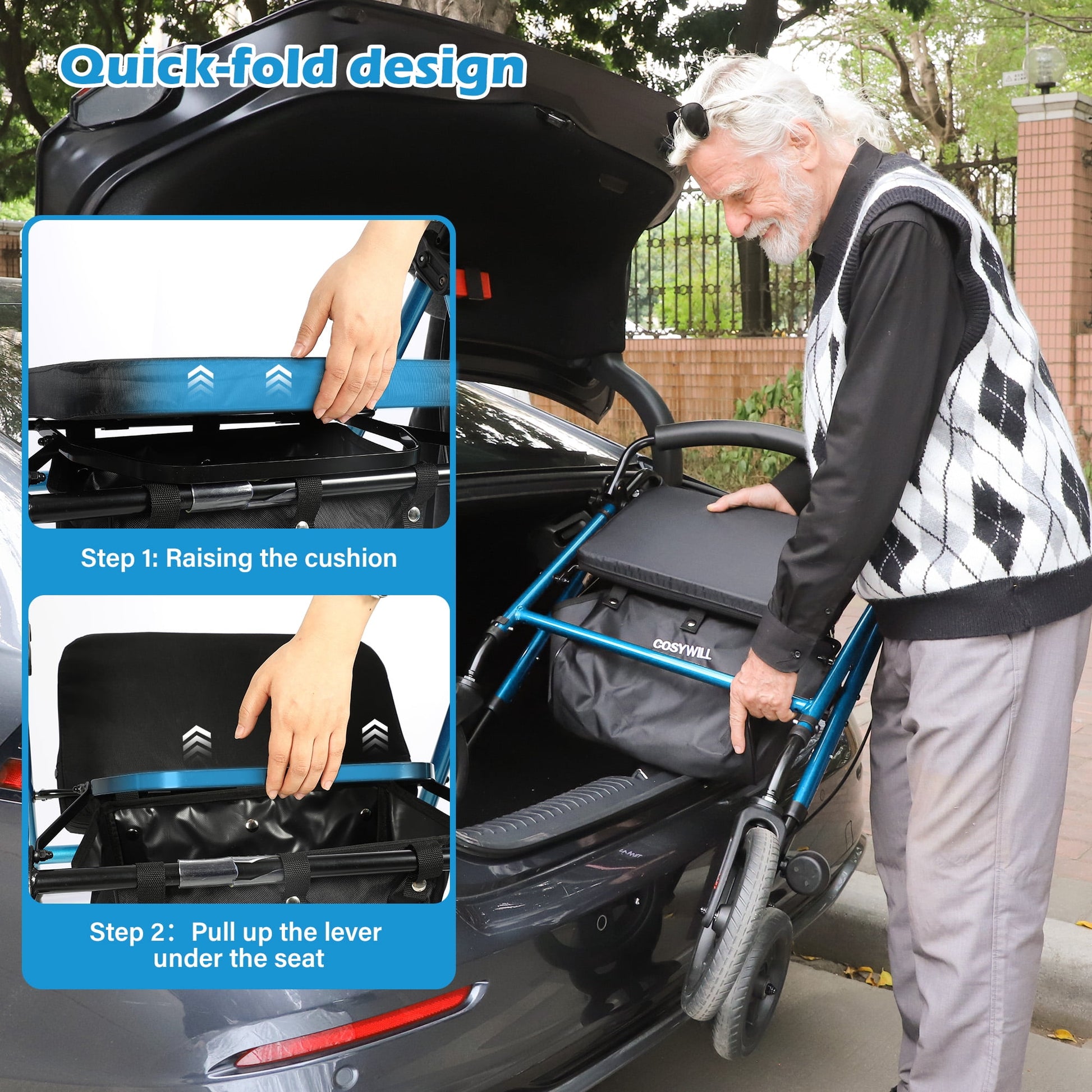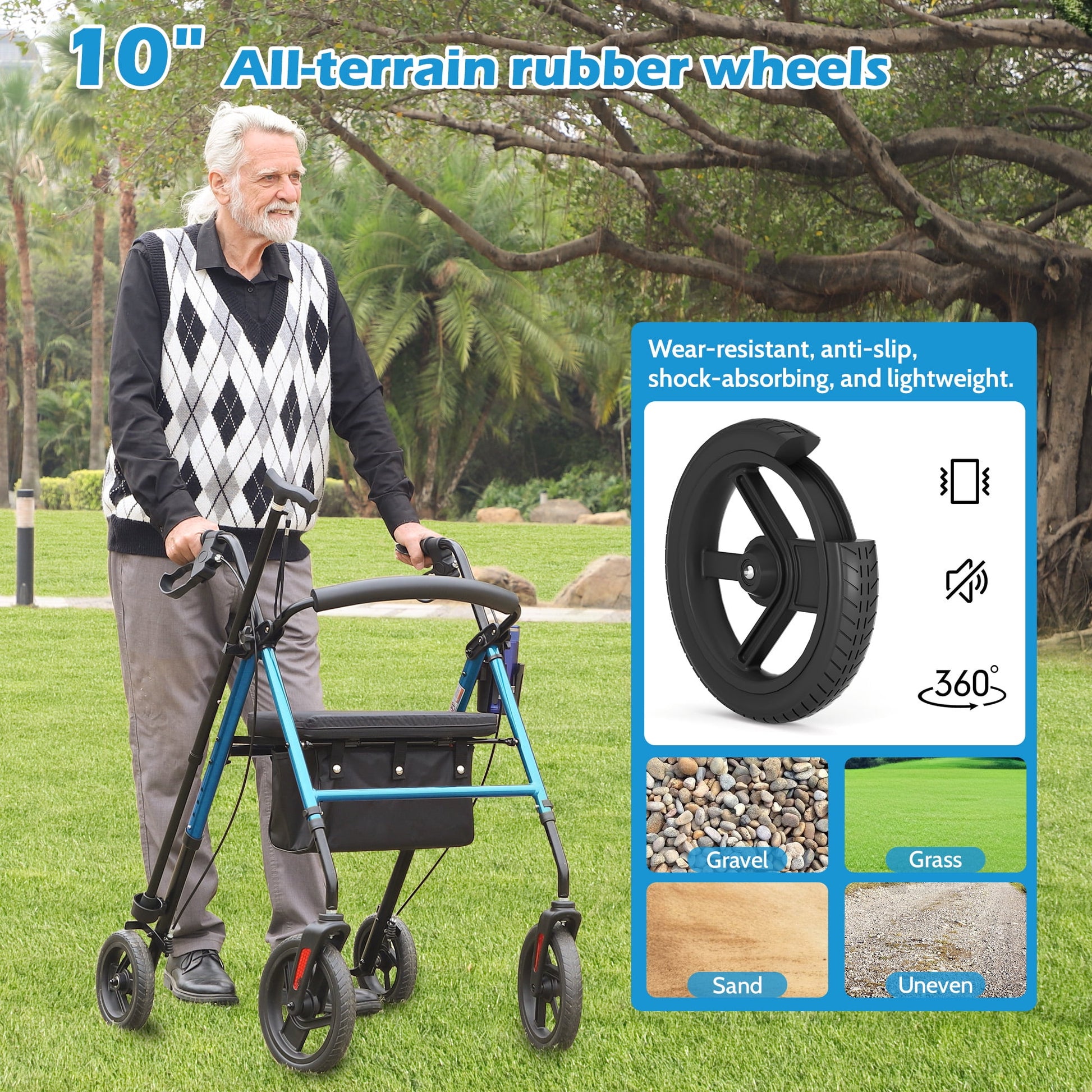COSYWILL Rollator Walker with Seat,Foldable Walkers for Seniors,Mobility Walkers with 10'' Big Wheels,Adjustable Handles and Seat Height,Blue