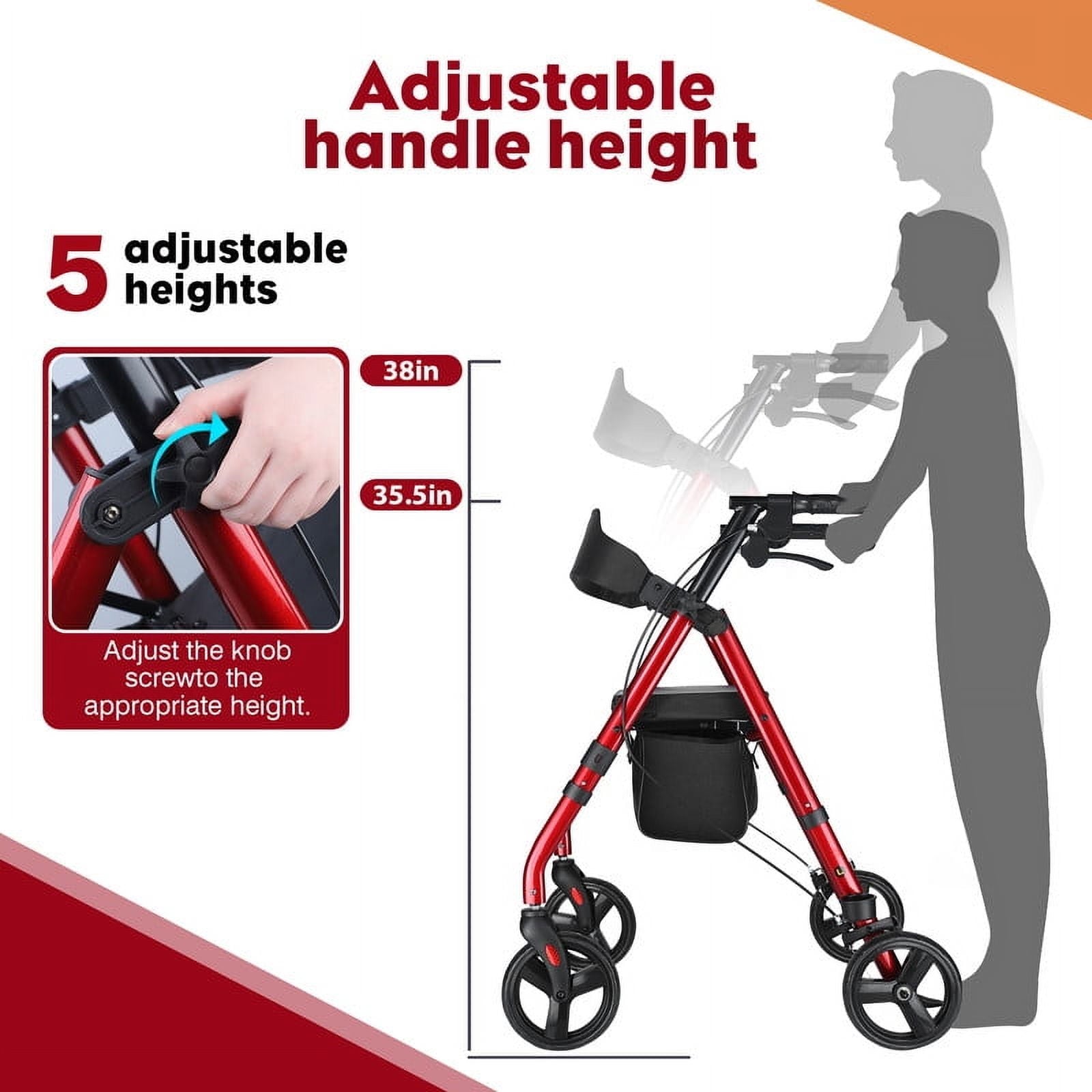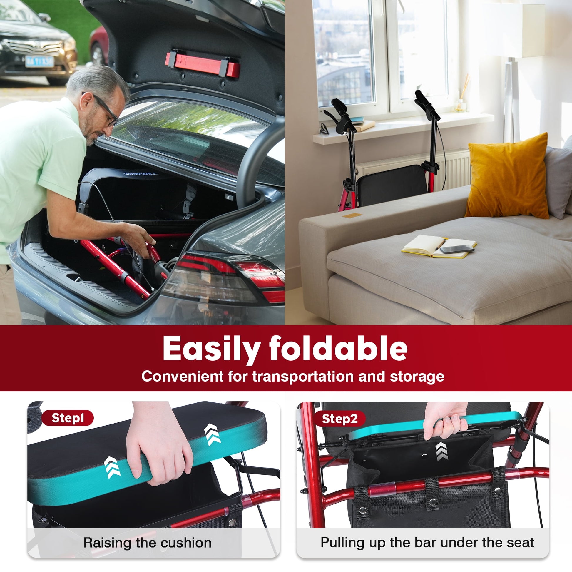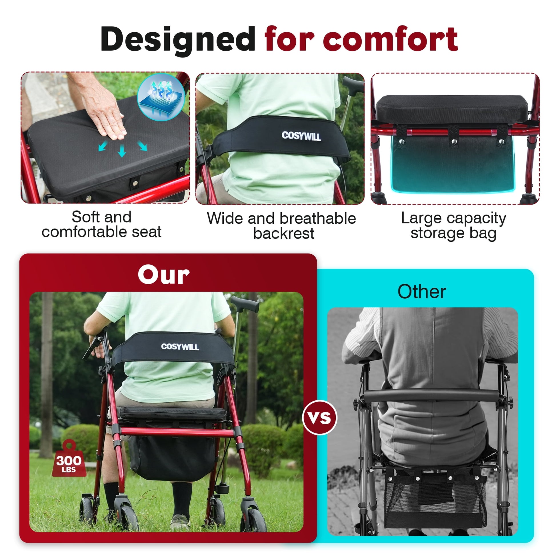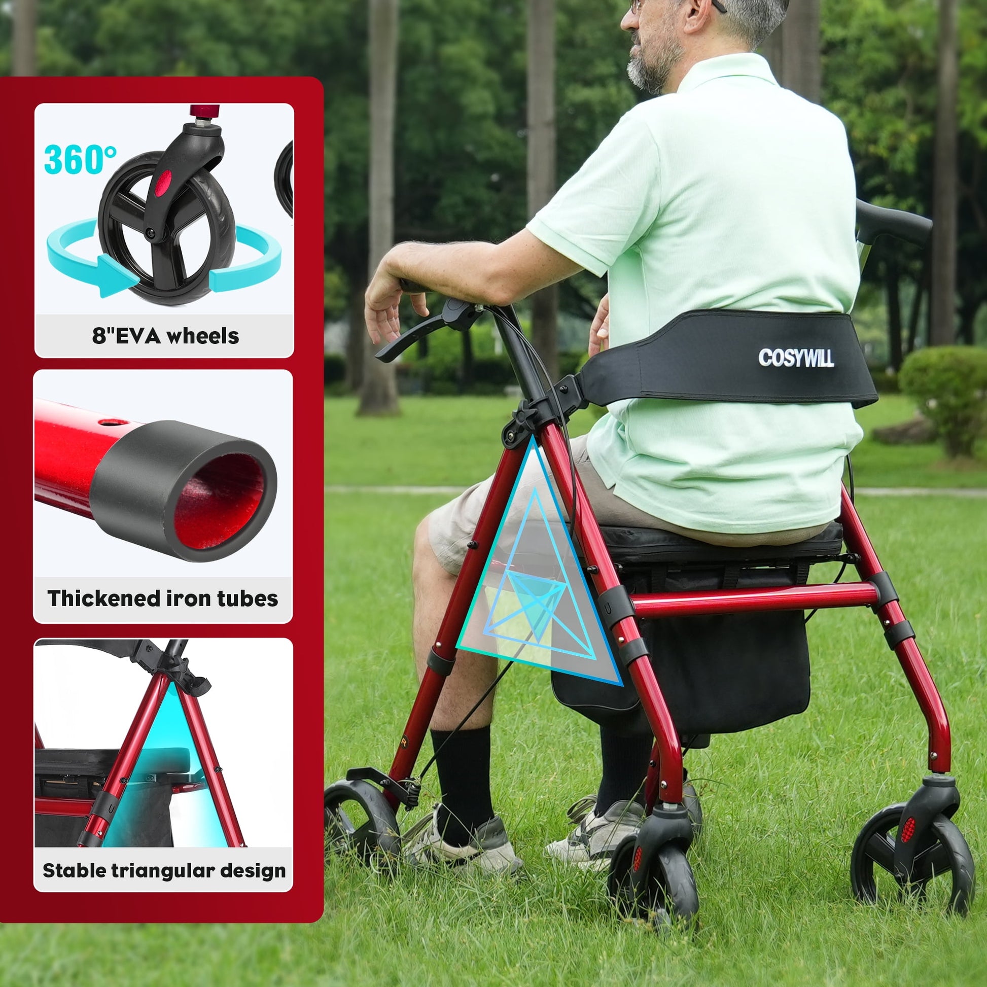 COSYWILL Rollator Walker with Seat,Foldable Mobility Walker with Durable Steel,Rolling Walker with 8" Wheels for All Terrain,Adjustable Height,300 lbs,Red