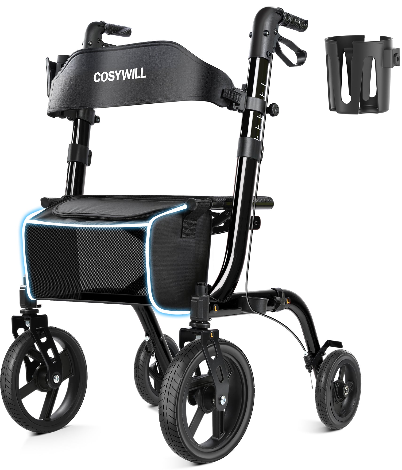 COSYWILL Rollator Walkers with Seat for Seniors, Foldable 10" Big Wheels All Terrain Rolling Walker,Adjustable Handles, Mobility Walker for Seniors,Black