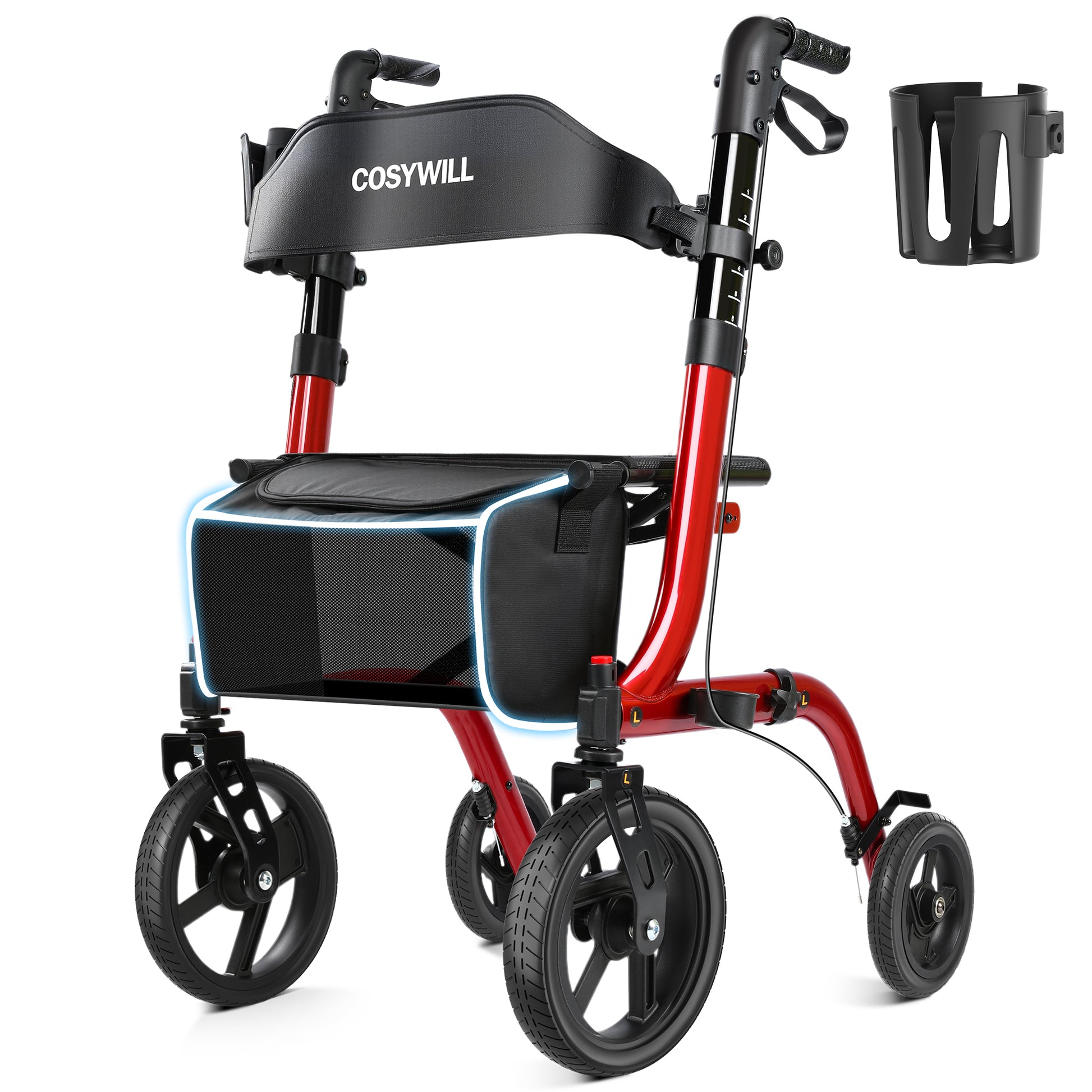 COSYWILL Rollator Walkers with Seat for Seniors, Foldable 10" Big Wheels All Terrain Rolling Walker,Adjustable Handles, Mobility Walker for Seniors,Light Red