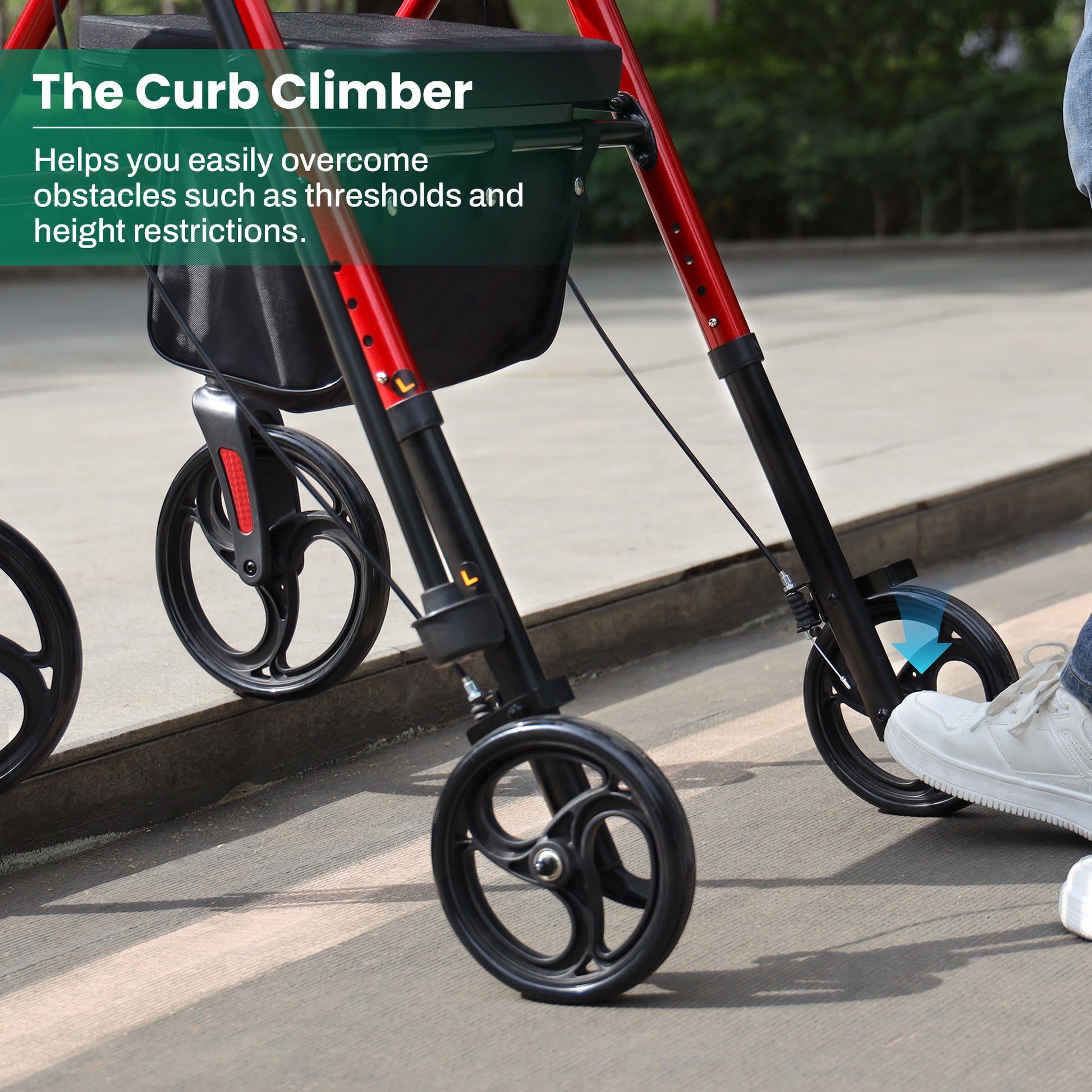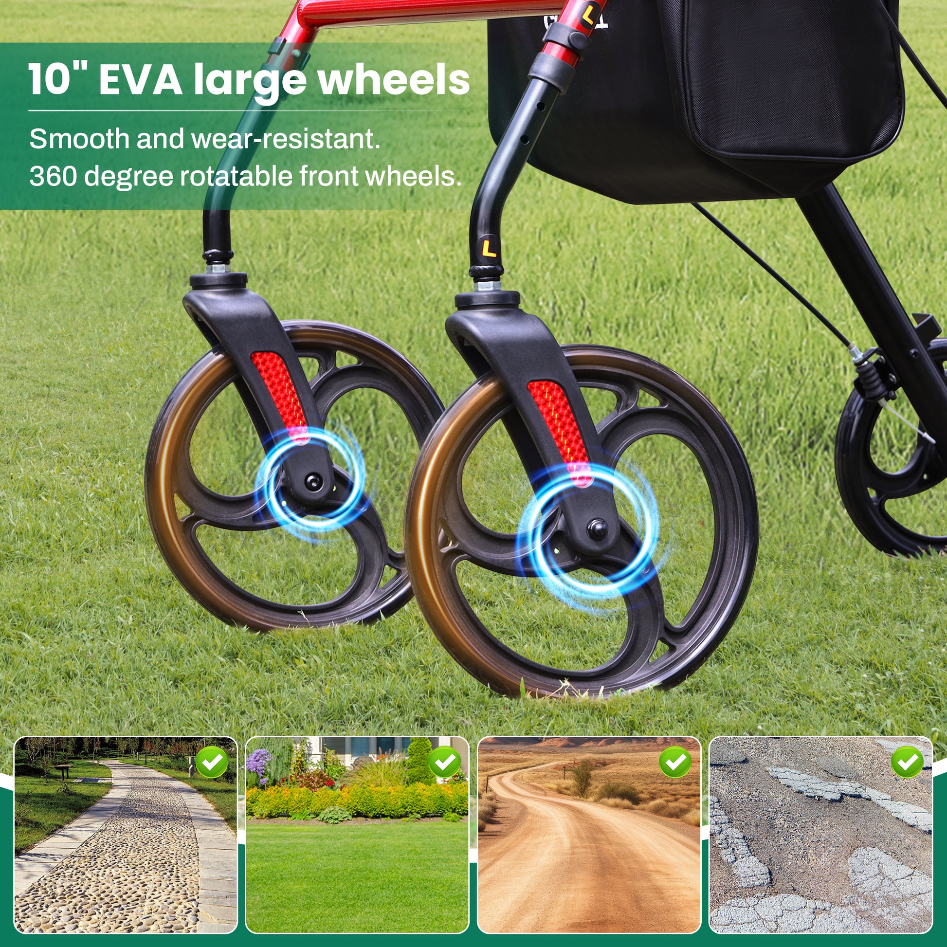 - 【Safe and Stable】:All-terrain rollator walker is equipped with 10" front wheels and 8" rear wheels. The 360° rotating front wheels are easy to maneuver and sturdy enough to travel smoothly both indoors and outdoors, easily handling various terrains. The ergonomic dual hand brakes allow you to pull the handbrake to slow down and push it down to lock the rear wheels. The rear wheels have metal brakes to further enhance stability. Stand up walkers for seniors helps you turn easily and avoid falls.
